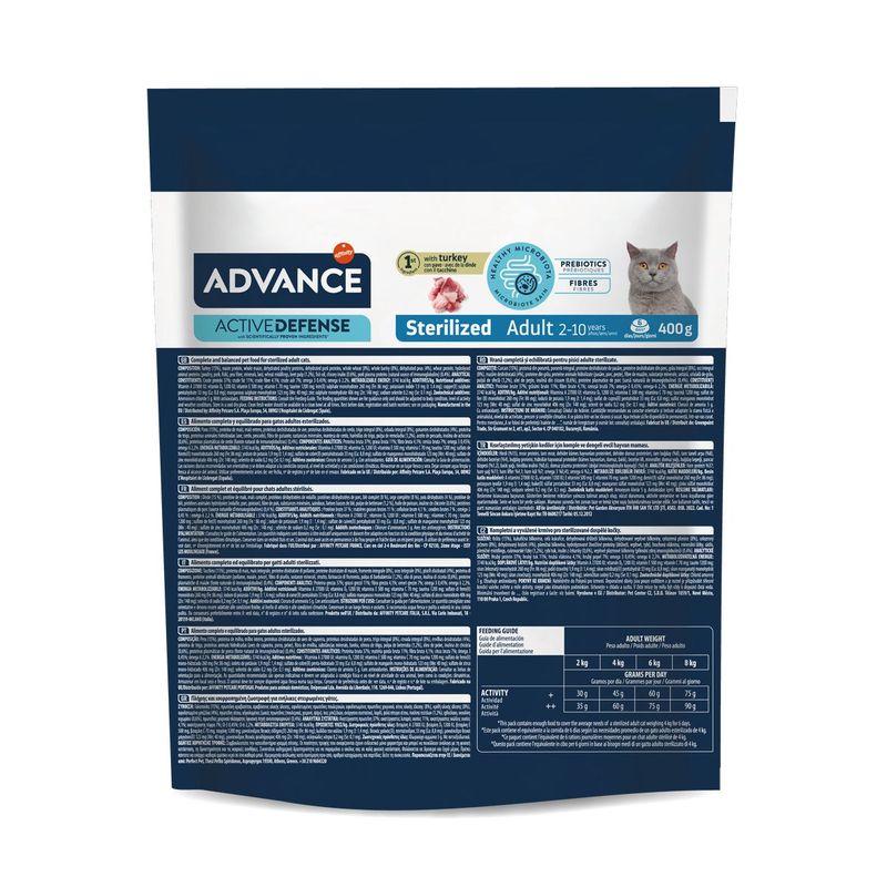 Advance Cat Sterilized Tacchino è un alimento secco completo ed equilibrato, sviluppato appositamente per soddisfare le necessità dei gatti adulti sterilizzati. Questo prodotto è appositamente consigliato per gatti sterilizzati dall'anno di vita in su, offrendo loro un'alimentazione completa e bilanciata che supporta il loro benessere complessivo. La sua formulazione è stata studiata da nutrizionisti esperti per contribuire al mantenimento del peso ideale del gatto e della sua massa muscolare, rinforza le difese e le barriere naturali del tuo gatto, mantenendo il pH dell'urina a livelli ottimali e prevenendo la formazione di tartaro. Questo alimento contiene la carne come fonte di proteina animale di alta qualità, con fibre e L-Carnitina che riducono il numero di calorie dell’alimento e aiuta a metabolizzare i grassi. La presenza di fibre, un livello moderato di grassi e un alto contenuto di proteine questo alimento supporta il mantenimento della massa muscolare e aiuta a mantenere il peso ideale del gatto. Queste crocchette offrono una varietà di sapori irresistibili che renderanno l'esperienza alimentare del tuo gatto più interessante e appagante. La consistenza sfiziosa di questo alimento è studiata per soddisfare anche i palati più esigenti, garantendo al tuo animale domestico un momento di puro piacere durante ogni pasto. Contiene minerali speciali (pirofosfati) che aiutano a prevenire la formazione del tartaro e favoriscono un alito fresco. Il tacchino, l'orzo e l'immunoglobuline contribuiscono alla salute digestiva e intestinale.