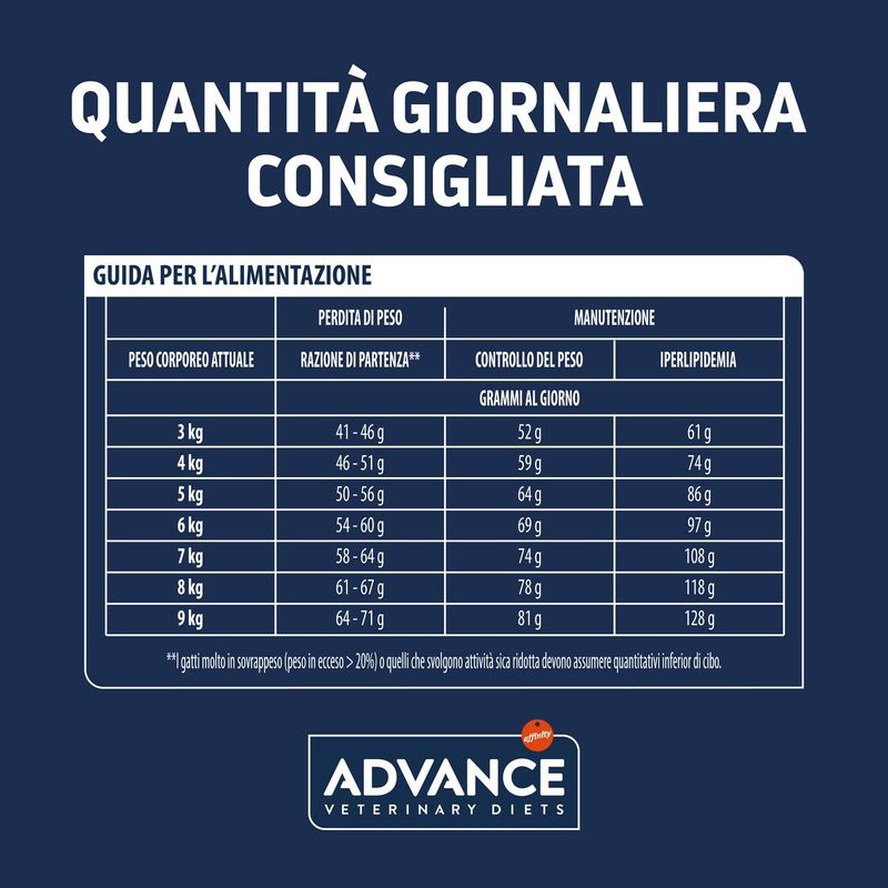 Advance Diets Cat Weight Balance è un alimento dietetico completo per gatti adulti, formulato per ridurre il peso in eccesso e regolare il metabolismo lipidico in caso di iperlipidemia. La sua formula a basso contenuto calorico e ridotto apporto di grassi aiuta a controllare il peso, mentre l'alto contenuto di acidi grassi essenziali supporta la salute generale del gatto. Inoltre, modifica il microbiota intestinale, aumentandone la ricchezza e rendendolo simile a quello di un gatto dal peso ideale. Studi clinici dimostrano che l'83% dei gatti riduce il proprio peso in soli tre mesi. Questo alimento è privo di coloranti e conservanti artificiali, per una dieta naturale e sicura.