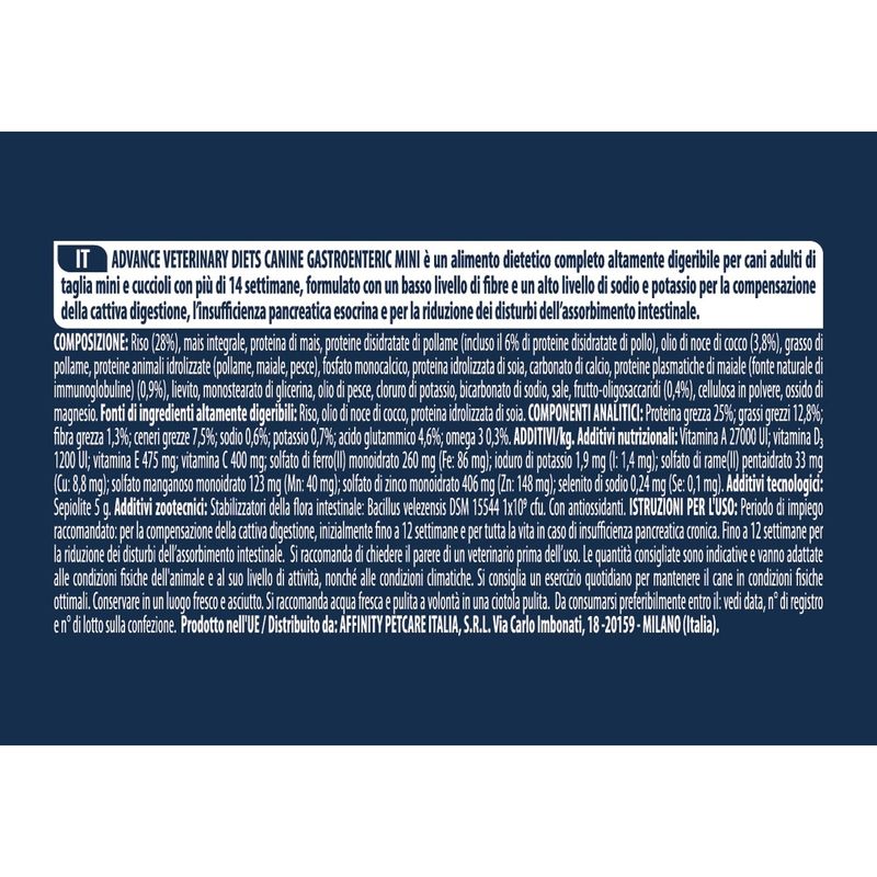 Advance Veterinary Diets Dog Adult Mini Gastroenteric Pollo è un alimento secco appositamente formulato per cani di taglia mini (fino a 10 kg) con problemi gastrointestinali, come diarrea o feci morbide. Questo prodotto è sviluppato da veterinari con l’obiettivo di migliorare la digestione e favorire un transito intestinale sano.