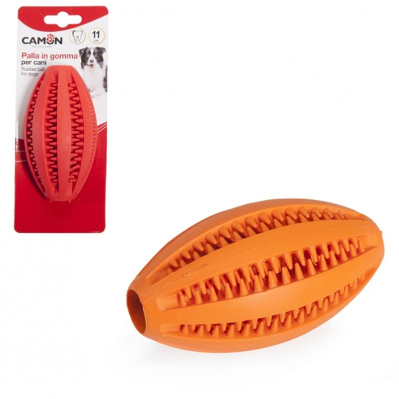 Questa pallina da Rugby Camon Dental Fun per cani è ovale e robusta, colorata e resistente, ideale per le ore di svago del tuo amico di zampa. Immagina di essere un quarterback di football americano: lancia la palla al tuo Fido e scopri le sue abilità da ricevitore. La palla Camon Dental Fun è studiata per adattarsi al morso del tuo cucciolone per una presa comoda e del tutto priva di rischi. Anzi, il giocattolo è ideale per prendersi cura dell'igiene orale del tuo cane: più la morderà maggiore sarà il beneficio per denti e gengive. Dimensione: 11 cm.