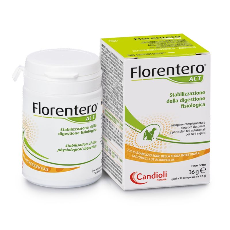 30CPFlorentero Act Compresse Appetibile è un mangime complementare per cani e gatti, formulato per aiutare a ridurre i disturbi acuti dell'assorbimento intestinale. Grazie al suo contenuto di elettroliti e ingredienti ad alta digeribilità, è particolarmente indicato durante episodi di diarrea acuta e nei periodi di convalescenza successivi. La nuova formula di Florentero Act è stata potenziata per offrire un supporto completo nella gestione dei problemi intestinali sia nei cani che nei gatti. Questo prodotto contiene l'unico ceppo vivo di Lactobacillus acidophilus autorizzato, che favorisce il ripristino dell'equilibrio della flora intestinale, insieme a un'esclusiva miscela di peptidi antimicrobici, le batteriocine, che contrastano la crescita di batteri nocivi. Florentero Act è arricchito con FOS (fruttoligosaccaridi) e MOS (mannano-oligosaccaridi), prebiotici che favoriscono il corretto sviluppo del microbiota intestinale. La presenza di Enterococcus faecium, un batterio probiotico, e di HECO, un complesso elettrolitico specifico, contribuisce ulteriormente a migliorare l'assorbimento dei nutrienti e a ristabilire l'equilibrio intestinale, mentre i nucleotidi aiutano a sostenere la rigenerazione cellulare e la funzione immunitaria.
