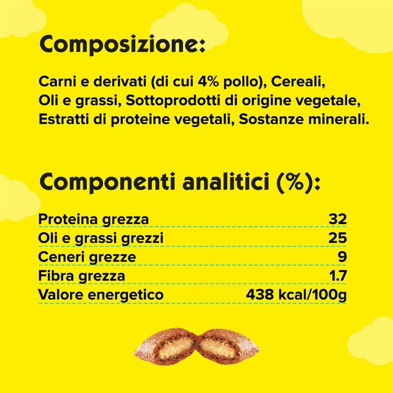 Il Catisfaction Snack Gatto Pollo è uno snack secco pensato per gatti e gattini di tutte le età. La sua doppia consistenza, croccante fuori e morbida dentro, è una vera esplosione di gusto che farà letteralmente leccare i baffi al tuo micio! Il cuore cremoso al all'Pollo è racchiuso in un guscio croccante che stimola la masticazione e appaga i sensi. Ottimo come premio o semplice coccola durante la giornata, questo snack è una vera delizia, perfetta per spezzare la noia e aggiungere un tocco di allegria alla routine del tuo gatto. E non preoccuparti, è realizzato senza coloranti né conservanti artificiali, per una bontà che puoi offrire con serenità.