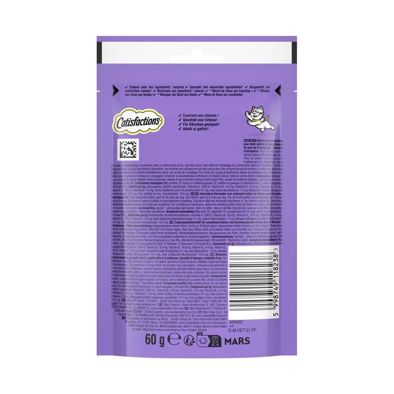 KIT RISPARMIO 3X60GCatisfactions è il brand che ha rivoluzionato il concetto di snack per gatti, trasformando ogni momento in un’occasione di puro gusto e divertimento. La sua missione è semplice: rendere felici i nostri amici felini con bocconcini irresistibili, perfetti per spezzare la routine con un tocco di golosità. Il punto di forza del marchio? Una doppia consistenza unica nel suo genere, che unisce il piacere del croccante alla bontà di un ripieno cremoso.