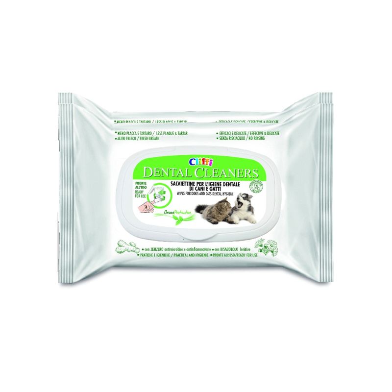 I Cliffi Dental Cleaners sono salviettine studiate appositamente per la pulizia dei denti di cani e gatti di tutte le taglie ed età. Appartenenti alla categoria cura e igiene orale, rappresentano un’alternativa pratica e veloce al dentifricio tradizionale, aiutando a prevenire placca e tartaro e riducendo così il rischio di patologie dentali, paradentali e sistemiche. La loro formula contiene Bisamolo, una sostanza con proprietà antinfiammatorie, lenitive e calmanti, che aiuta a mantenere le gengive sane e protette. Grazie agli ingredienti dermo-compatibili e al pH fisiologico, sono ben tollerate anche dai pet più sensibili. Con il 98,5% di ingredienti di origine naturale, queste salviettine rispettano la salute della bocca e rendono la pulizia quotidiana più sicura. L’uso costante non solo contribuisce alla salute orale, ma regala anche un alito fresco al tuo pet. Sono facili da usare: basta avvolgere la salvietta sul dito e passarla delicatamente su denti e gengive, senza necessità di risciacquo.