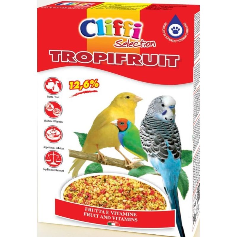 Offri ai tuoi uccelli granivori da compagnia l'alimentazione di alta qualità che meritano con Cliffi Tropifruit Uccelli, un alimento completo e gustoso che li terrà felici e in salute ogni giorno.