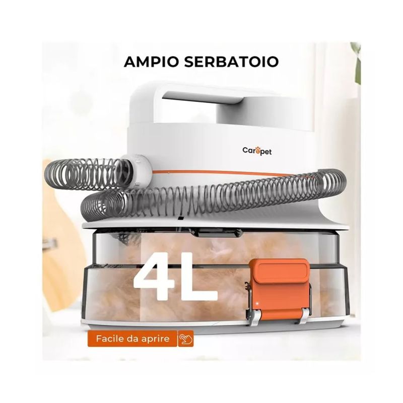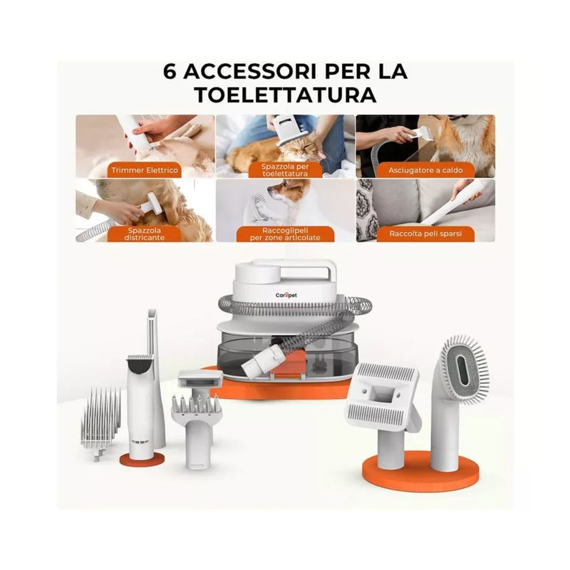 Il Carepet Kit Toelettatura per Animali 6-in-1 è un sistema completo e multifunzione, pensato per semplificare la cura del pelo di cani e gatti. Rientra nella categoria accessori per la toelettatura domestica ed è ideale per animali di tutte le taglie e tipologie di pelo. Questo dispositivo combina le funzioni di aspirazione, soffiaggio e asciugatura, permettendo di rimuovere facilmente peli superflui, nodi e sporco senza stress per l’animale. È dotato di 6 accessori intercambiabili: spazzola per rimozione peli, spazzola per toelettatura, spazzola districante, asciugatore, trimmer elettrico con 4 pettini guida (6 mm, 12 mm, 18 mm, 24 mm) e bocchetta per le zone più difficili. Il motore silenzioso con 3 livelli di velocità regolabile e il convertitore ruotabile a 180° offrono un'esperienza pratica e personalizzabile. Il serbatoio da 4 litri raccoglie in modo efficiente i peli rimossi e si svuota con facilità grazie al sistema "facile da aprire". Una soluzione completa per mantenere il tuo pet pulito, ordinato e felice.