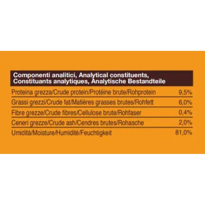 N.B. Il prodotto si presenta in formato multipack lattina da 24x85g, nei gusti a scelta: Mix Carne (12x Manzo e 12x Pollo) e Mix Pesce (12x Salmone e 12x Tonno), Mix Carne e Pesce (8x Manzo, 8x Pollo e 8x Pesce dell’oceano.)