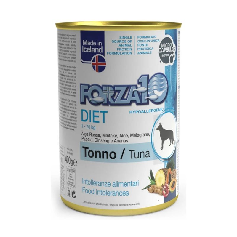 Forza10 Diet Tonno è un alimento umido dietetico completo in lattina, per cani adulti di tutte le razze. Questo prodotto è indicato per la riduzione delle intolleranze alimentari a ingredienti e sostanze nutritive avverse, risultando particolarmente utile in caso di dermatosi ed eccessiva perdita di pelo. Inoltre, può essere impiegato durante la fase di recupero post-operatorio. L'alimento è privo di conservanti aggiunti e contiene tonno come unica fonte proteica animale. Il tonno pescato in mare aperto è altamente digeribile e favorisce la crescita e lo sviluppo delle masse muscolari del cane. Essendo una proteina di alta qualità, il tonno contribuisce a mantenere il benessere generale del tuo cane, offrendo un apporto bilanciato di nutrienti essenziali.