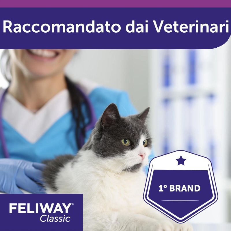 La ricarica inclusa nella confezione sprigiona un analogo sintetico dei feromoni utilizzati dai gatti per marcare il loro territorio e sentirsi tranquilli. Questo permette di creare un ambiente confortevole e sereno per il tuo felino, riducendo comportamenti indesiderati come graffiature, marcature urinarie o aggressività. Ogni ricarica ha una durata minima di 3 settimane e copre un'area di 50-70 metri quadrati, garantendo una protezione costante e efficace per il tuo felino e il suo habitat domestico. Inoltre, Feliway Classic è clinicamente provato, utilizzato e raccomandato dai veterinari, assicurando una soluzione sicura ed efficace per il tuo gatto.