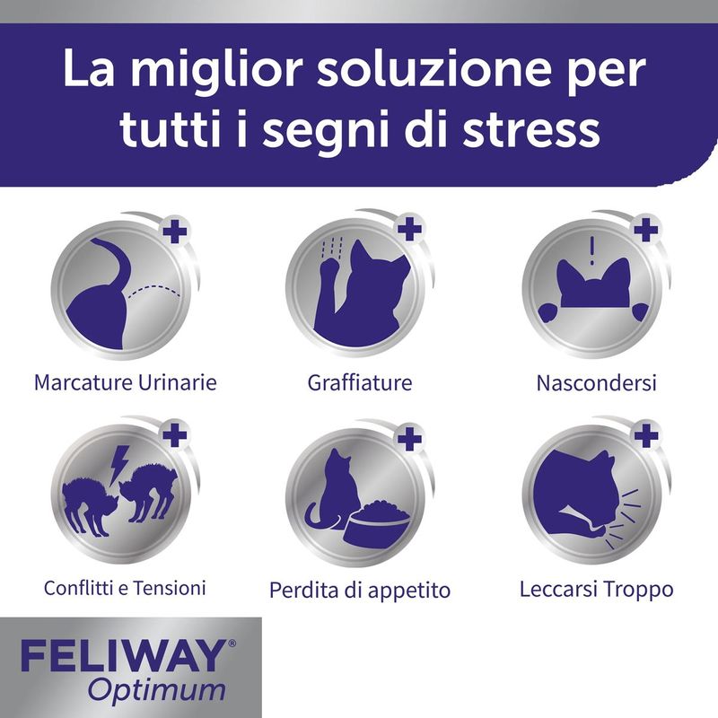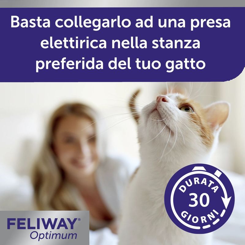 È ideale in tante situazioni quotidiane: dall'arrivo di un nuovo animale o di un bambino, ai traslochi, fino ai momenti in cui il tuo gatto manifesta segnali di disagio come leccamento eccessivo, riduzione dell'appetito o piccoli conflitti con altri gatti di casa. Con Feliway Optimum, puoi aiutarlo ad affrontare ogni cambiamento con maggiore serenità.