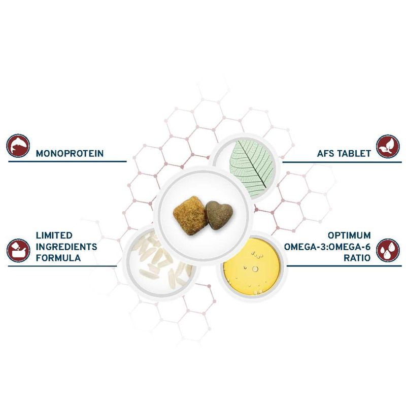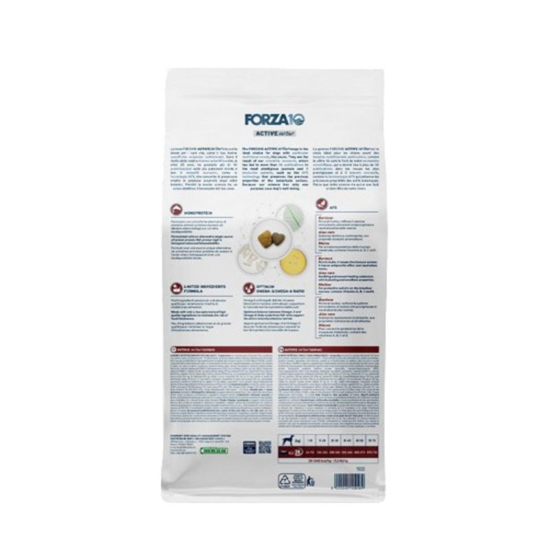 Forza10 Dog Active Vet Diet Dermo è un alimento secco dietetico completo, per cani adulti di tutte le razze, che supporta la funzione dermica in caso di dermatosi ed eccessiva perdita di peli. Questo prodotto è formulato con pesce ad alto valore biologico e con alta biodisponibilità come unica fonte alternativa di proteina animale, per garantire un apporto proteico ottimale e altamente digeribile. Il cibo contiene pochi ingredienti selezionati e di elevata qualità, riducendo il rischio di intolleranze alimentari. È arricchito con AFS tablet, che includono ingredienti naturali benefici come bardana, ricca di inulina, rafforza il sistema immunitario, con azione antipruriginosa e neutralizzante delle tossine. Aloe vera, nota per le sue proprietà lenitive, cicatrizzanti, idratanti ed emollienti e malva, che fornisce un’azione protettiva della mucosa intestinale. Inoltre, questo alimento è arricchito con vitamine essenziali come A, B, C ed E, che contribuiscono alla salute generale del cane. Forza10 Dog Active Vet Diet Dermo contiene anche un rapporto ottimale tra Omega-3 e Omega-6, derivati dall’olio di pesce, bilanciati in modo da supportare la naturale barriera protettiva della cute, promuovendo una pelle sana e un pelo lucido.
