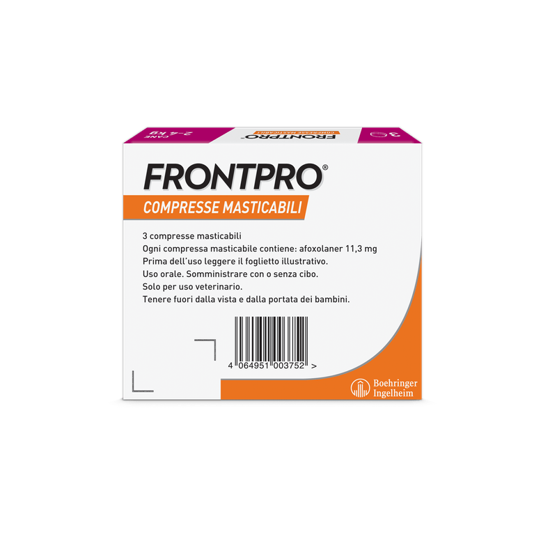 Consigli utiliProdotto di facile somministrazione, idoneo per il trattamento delle infestazioni da pulci nei cani, per almeno 5 settimane e delle infestazioni da zecche nei cani, per un mese. FRONTPRO elimina le pulci entro 8 ore e le zecche entro 48 ore dalla somministrazione. Il prodotto elimina le pulci prima che producano le uova prevenendo quindi la contaminazione della casa. Utilizzabile nelle cagne in gravidanza e allattamento. Applicabile sui cuccioli a partire dalle 8 settimane di vita e/o di peso superiore ai 2Kg. Disponibile senza ricetta veterinaria.
