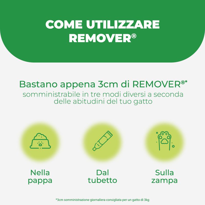 20GRemover Alimento Complementare per Gatti in pasta è pensato per aiutare i gatti a gestire l’ingestione di peli e prevenire la formazione dei fastidiosi boli di pelo. I gatti, infatti, hanno l’abitudine di leccarsi frequentemente il mantello, e questo comporta una continua ingestione di peli che, accumulandosi nell'intestino, possono causare disturbi digestivi. Remover, grazie alla sua formulazione, aiuta a regolare le funzioni intestinali e a favorire l'eliminazione dei peli ingeriti, migliorando al contempo l’assimilazione degli alimenti.