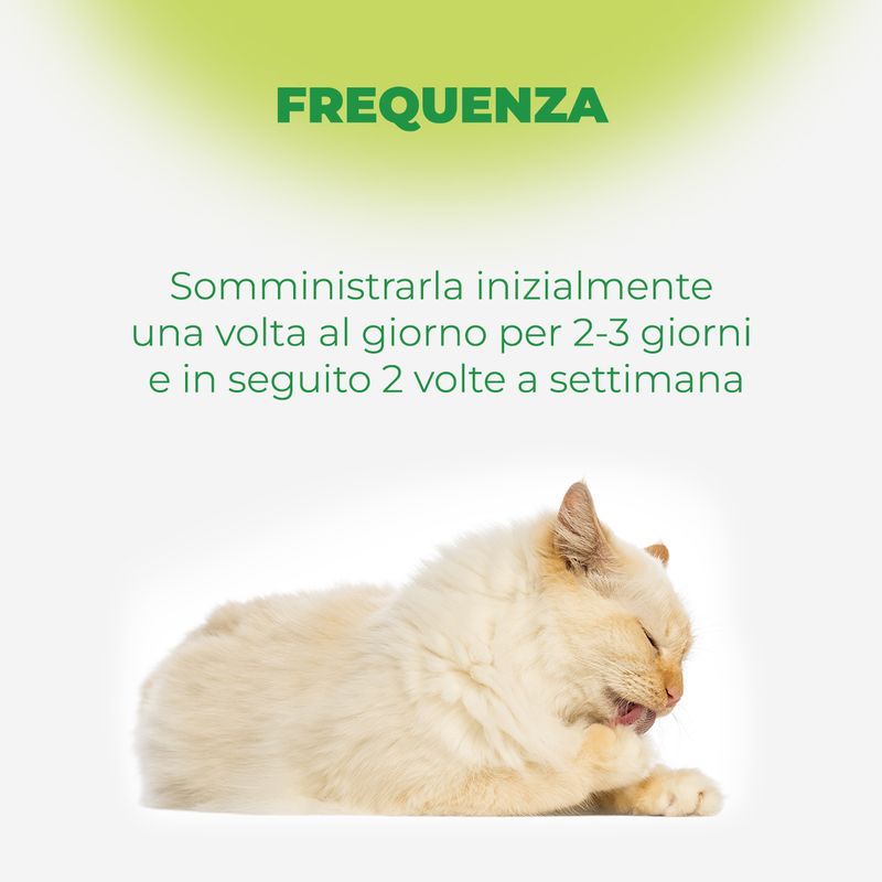 Il prodotto è particolarmente gradito dai gatti per il suo sapore, ed è possibile somministrarlo in diversi modi: mescolato al cibo o direttamente nella bocca del gatto. Se il tuo gatto è particolarmente difficile, un’ottima soluzione è applicare la dose raccomandata sulla sua zampa, in modo che la ingestione avvenga durante il leccamento.