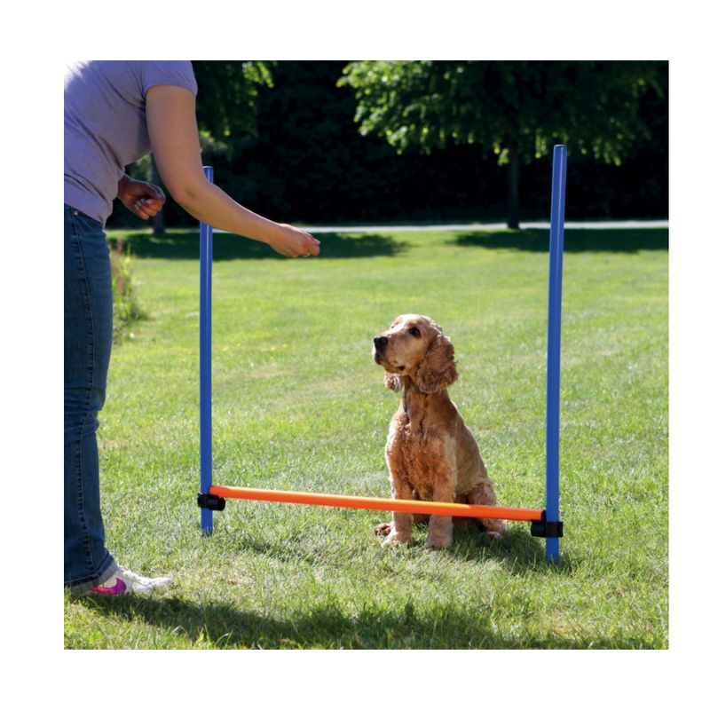 L'ostacolo di Trixie è l'ideale per creare un percorso personalizzato di sport e agility per il tuo cane. Il set è composto da: 2 aste verticali, 1 asta orizzontale e 2 supporti. L'asta orizzontale è appoggiata su quelle verticali affinchè il cane non si faccia male; inoltre grazie alla possibilità di regolazione dell'altezza, l'ostacolo è adatto anche ai cani più inesperti. Le 3 sbarre sono custodite in una pratica borsa di nylon, per consentirti di poterlo portare sempre con te durante le passeggiate all'aria aperta con il tuo peloso. Grazie alle punte metalliche poste all'estremità delle sbarre potrai allestire l'ostacolo sia in giardino che su un prato. Misure: 123 × 115 cm, ø 3 cm. Colore: blu/arancione.