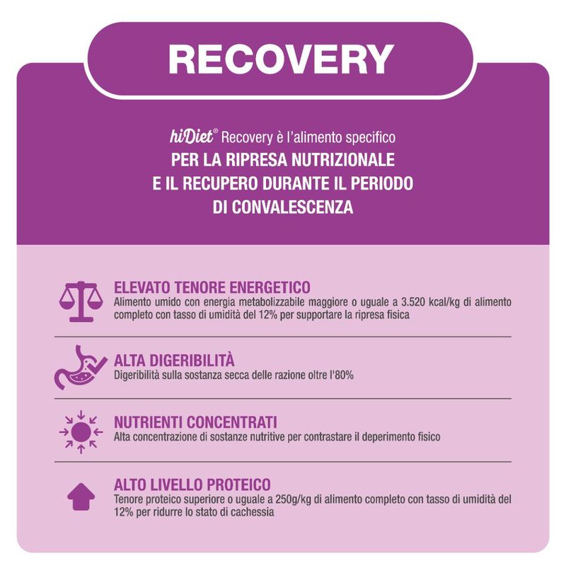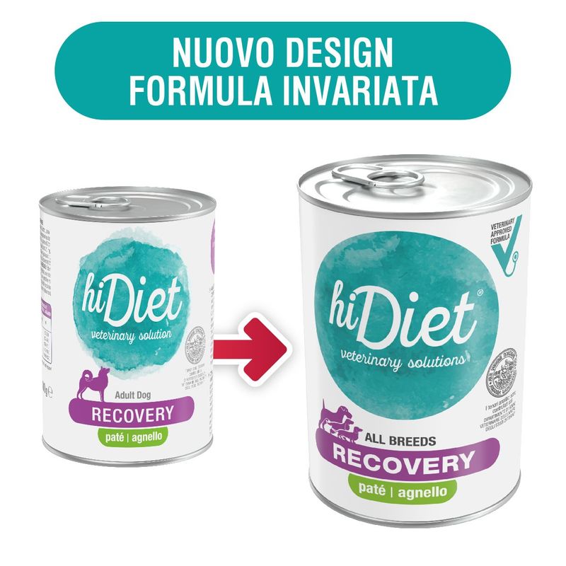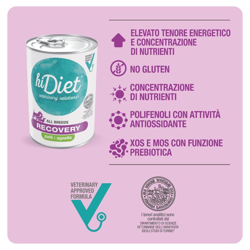 Il tuo cane ha appena subito un intervento e stai cercando l'alimentazione giusta post-ripresa? La formula Recovery di Hi Diet ti propone un cibo umido con agnello ideale per alimentare il tuo cane durante la fase di convalescenza o di terapia intensiva, quando può avere delle difficoltà a mangiare normalmente