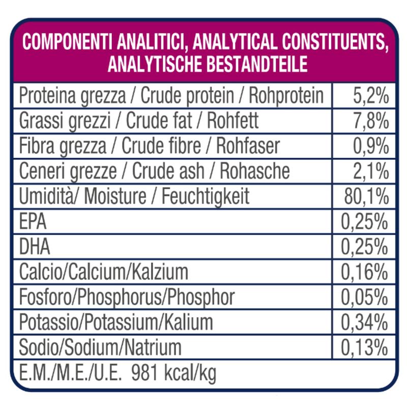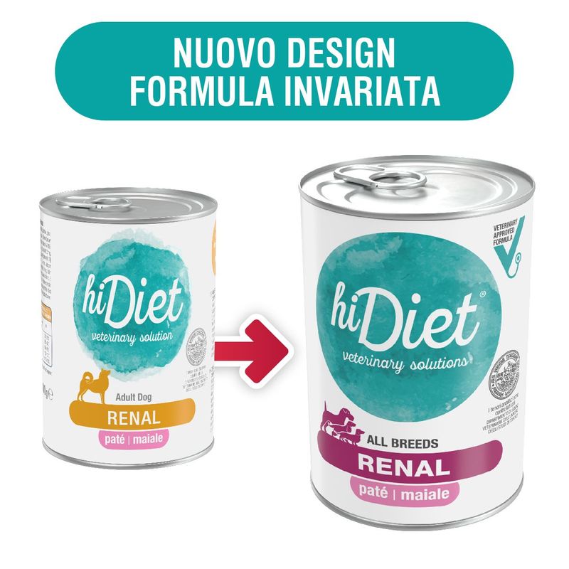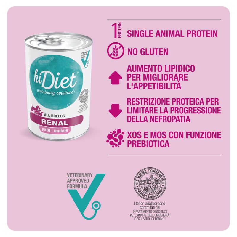 Hi Diet Dog Renal Paté con Maiale è un alimento dietetico umido in lattina per cani adulti, che soffrono di insufficienza renale cronica. Questo prodotto è stato sviluppato con grande attenzione per fornire una soluzione efficace a cani che soffrono di problemi legati all’insufficenza renale cronica. Il patè al maiale è sottoposto a rigorosi controlli di qualità effettuati dal dipartimento di Scienze Veterinarie dell’Università degli Studi di Torino, garantendo così un prodotto affidabile e di alta qualità. Questo alimento utilizza materie prime di alta qualità e fonti alternative di proteine attentamente selezionate per garantire una corretta nutrizione e fornisce amminoacidi di elevato valore biologico, rendendo il pasto più facilmente digeribile per il tuo animale domestico. Questo prodotto contiene un basso contenuto di fosforo, evitando così un sovraccarico renale e la riduzione del contenuto proteico all'interno del prodotto (220 g/kg di PG) coadiuva l'utilizzazione degli aminoacidi, contribuendo a ridurre la produzione di sostanze azotate di scarto, come l'urea. Inoltre, per gestire la fosfatemia, è stato incluso il carbonato di calcio, un agente in grado di sequestrare il fosforo introdotto con l'alimentazione, rendendolo meno disponibile per l'organismo.
