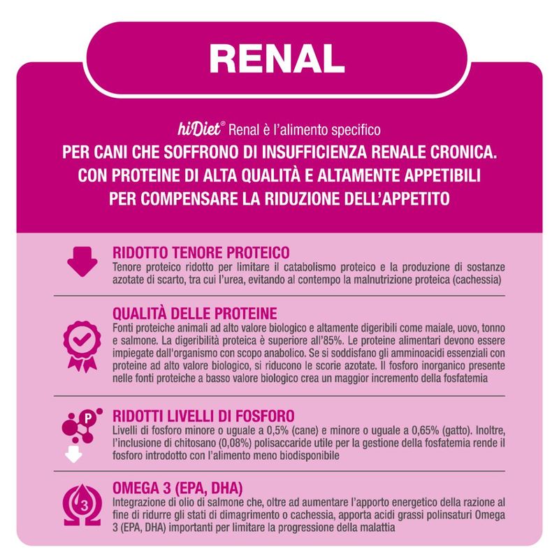 Hi Diet Dog Renal è una linea di alimenti creata appositamente dai veterinari per rispondere alle esigenze nutrizionali particolari associate a problemi di insufficienza renale cronica. Puoi fidarti che questa linea di alimenti offrirà una combinazione bilanciata di nutrienti essenziali, con un focus particolare sul controllo del contenuto di fosforo e la gestione dell'equilibrio idrico. Investi nella salute renale del tuo fedele amico con Hi Diet Renal e offrigli una dieta attentamente studiata per affrontare le sfide specifiche legate a questa condizione.