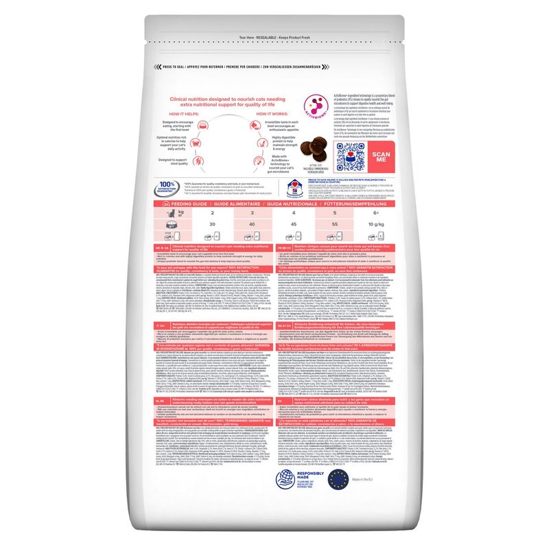L'alimento secco Hill's Prescription Diet Cat On-Care Pollo è stato appositamente creato per nutrire e supportare i gatti affetti da malattie importanti e convalescenti, quando non possono mangiare o bere. Al tuo amico a quattro zampe viene diagnosticata una malattia grave? Allora è fondamentale garantire il soddisfacimento delle sue esigenze nutrizionali. Questo delizioso alimento secco a base di pollo, grassi saporiti e proteine offre al tuo peloso un'ottima esperienza durante il pasto per una sana digestione. I nutrienti altamente digeribili di Diet On-Care sono facili da assorbire per i micetti. Il gusto irresistibile di ogni ciotola favorisce un appetito entusiasta, incoraggiando il consumo fin dalla prima ciotola. Inoltre, le proteine altamente digeribili aiutano a mantenere la forza e l'energia del tuo micio. La ricetta è reallizata con una miscela di ingredienti brevettata ActivBiome+, che si è dimostrata in grado di nutrire i batteri intestinali benefici e di favorire un sano equilibrio del microbioma gastrointestinale. Formulato specialmente per promuovere un ambiente urinario che riduce il rischio di sviluppare cristalli di struvite e ossalato di calcio, offrendo al tuo gatto una soluzione completa per la sua salute.