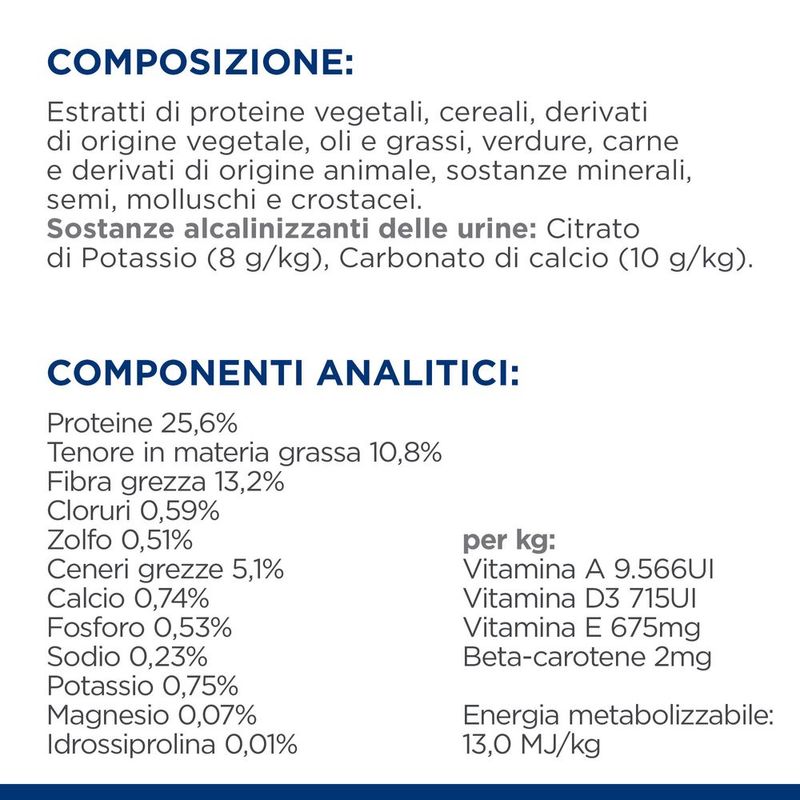 Hill's Prescription Diet c/d Urinary + Metabolic Alimento Secco per Cani è un alimento secco dietetico completo, specificamente formulato per ridurre le recidive di calcoli di struvite, dissolvere i calcoli di struvite già presenti, ridurre la formazione di calcoli di ossalato e diminuire il peso corporeo in eccesso nei cani adulti. Questo alimento secco contiene ingredienti di alta qualità, selezionati per le loro proprietà nutritive e benefici specifici per la salute urinaria e la gestione del peso. La formulazione è studiata per fornire tutti i nutrienti essenziali di cui il tuo cane ha bisogno, mantenendo al contempo un basso apporto calorico per favorire la perdita di peso. Questo prodotto aiuta a mantenere sana la vescica, offrendo una nutrizione che favorisce un calo di peso visibile. La formulazione di Hill's Prescription Diet c/d Urinary + Metabolic presenta una bassa densità energetica, che contribuisce alla perdita di peso del cane. Le sue proprietà includono la sottosaturazione urinaria per la struvite, l'alcalinizzazione delle urine e un basso tenore di magnesio, calcio e vitamina D. Questi elementi sono essenziali per mantenere un ambiente urinario ottimale e prevenire la formazione di nuovi calcoli. I livelli controllati di minerali in questo alimento sono pensati per preservare la salute delle vie urinarie del cane. Questo aiuta a favorire un ambiente vescicale corretto, promuovendo la salute futura delle vie urinarie. Inoltre, la miscela sinergica di ingredienti è studiata per supportare il metabolismo del cane, contribuendo a una gestione efficace del peso e alla prevenzione dei calcoli.