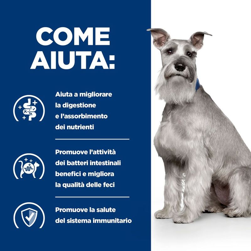 Hill's Prescription Diet i/d Digestive Care Low Fat Spezzatino per Cani è un alimento umido dietetico completo altamente digeribile per cani adulti, specificamente formulato per supportare la salute digestiva del tuo cane. Questo alimento è clinicamente provato per calmare e lenire il tratto digestivo. Realizzato con la tecnologia esclusiva di Hill's ActivBiome+, una speciale miscela di fibre prebiotiche, questo alimento è clinicamente testato per nutrire rapidamente il microbioma intestinale, supportando la qualità ottimale delle feci e la salute complessiva dell'apparato digerente. Grazie a questa tecnologia avanzata, l'alimento promuove un equilibrio ottimale della flora intestinale, garantendo una digestione efficiente e un assorbimento ottimale dei nutrienti. Gli irresistibili spezzatini rendono più facile consolidare il legame con il tuo animale grazie a bocconi a misura di morso, cotti delicatamente con pollo e verdure aggiunte. Gli acidi grassi Omega-3 e Omega-6 presenti nella formula contribuiscono a ridurre l'infiammazione e a migliorare la salute della pelle e del mantello, mentre gli antiossidanti clinicamente testati aiutano a sostenere un sistema immunitario forte e sano. La sua elevata digeribilità è ottenuta grazie all'arricchimento con elettroliti e vitamine del gruppo B, che facilitano l'assorbimento dei nutrienti essenziali e aiutano a sostituire quelli persi a causa dei problemi digestivi. Inoltre, lo psyllium promuove la sana motilità e regolarità intestinale.
