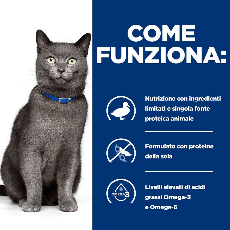 • Alimento secco veterinario per gatti con reazioni allergiche o sensibilità alimentari.
