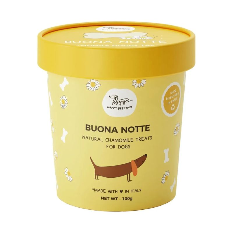 Hygge Dog Biscotti Buona Notte sono il modo più dolce per dire “a domani” al tuo cane. Questo snack secco è pensato per cani di tutte le età, perfetto da offrire la sera, prima della nanna o nei momenti in cui serve un po’ di relax. La loro formula unica unisce camomilla, dalle note proprietà antinfiammatorie, antimicrobiche e antiossidanti, a un pizzico di valeriana, un rimedio naturale noto per il suo effetto calmante. Insieme aiutano a rilassare i muscoli, ridurre lo stress e favorire il sonno del tuo amico peloso, trasformando la routine serale in un rituale di serenità. E per chi ama prendersi cura anche del pianeta, c’è un dettaglio in più: il packaging è 100% smaltibile nella carta, per una scelta davvero green. Naturalmente, i biscotti sono senza coloranti, senza conservanti e realizzati con ingredienti naturali.
