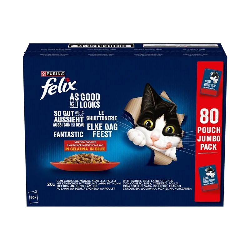 Composizione: Composizione: Carni e derivati* (14%, di cui pollo 8%), Estratti di proteine vegetali, Pesci e sottoprodotti dei pesci, Sostanze minerali, Zuccheri. *bocconcini: 44% carni e derivati.