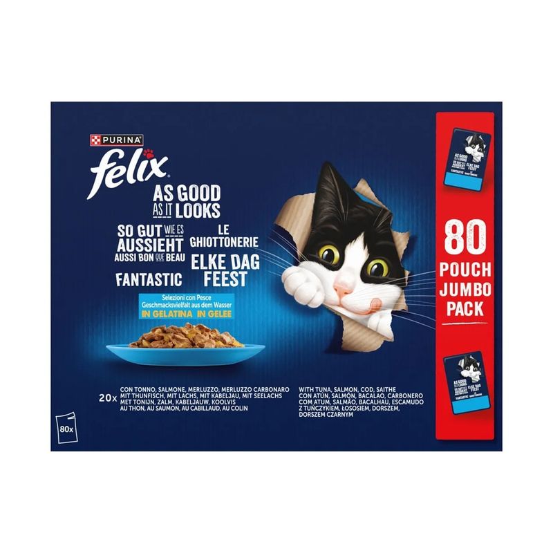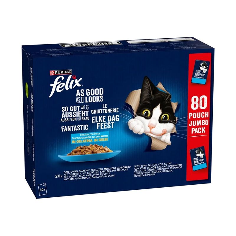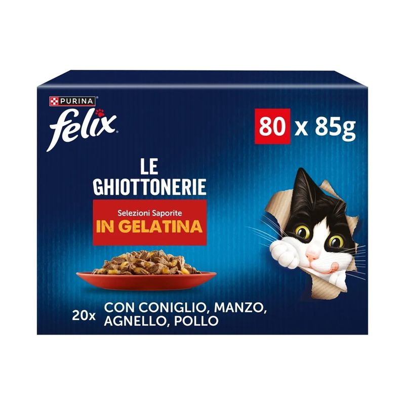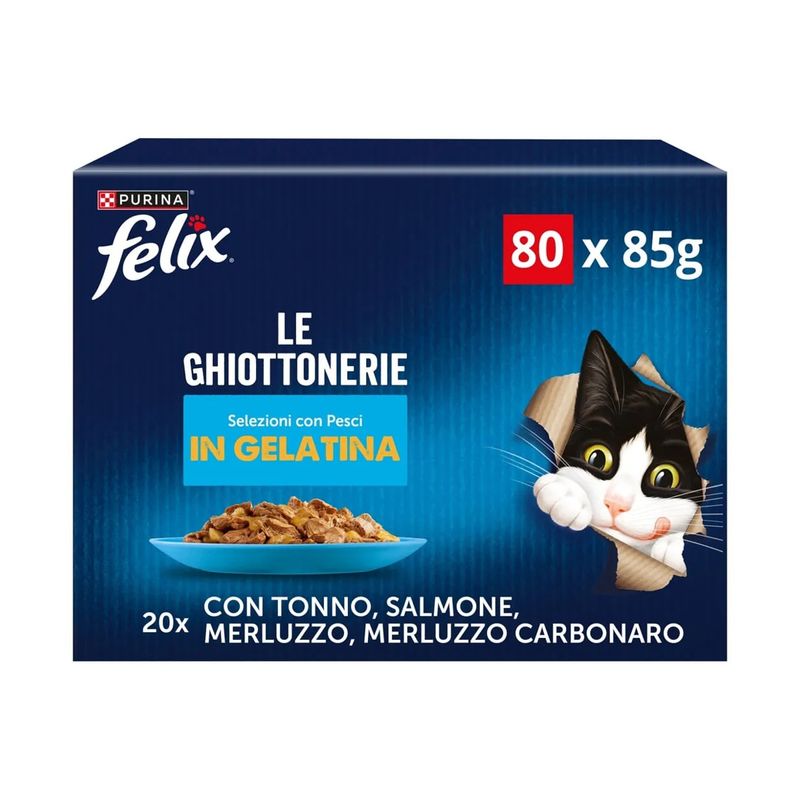 Composizione: Carni e derivati* (12%), Estratti di proteine vegetali, Pesci e sottoprodotti dei pesci (merluzzo 4%), Sostanze minerali, Zuccheri. *bocconcini: 40% carni e derivati.