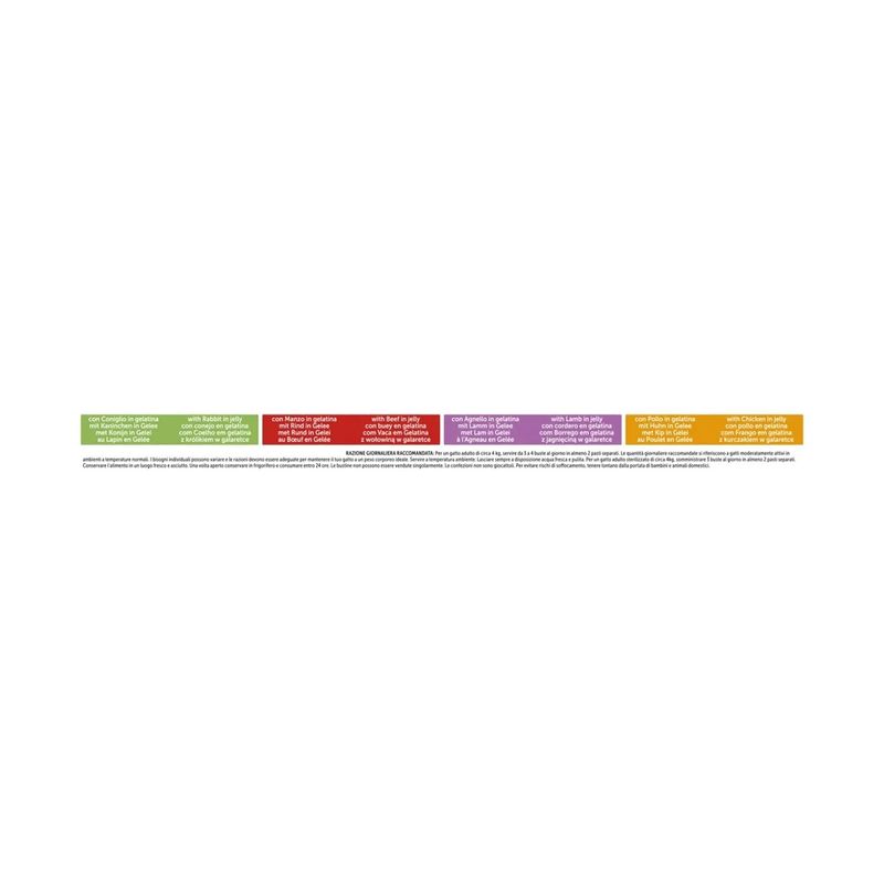 Additivi nutrizionali: Ul/kg: Vit A: 720; Vit E: 16; Vit D,: 110 jesclusa la ricetta con tonno: 0l; mg/kg: 30103: (Fe: 8,3): 50202: [I: 0,31): 3b405: (Cu: 0,72); 3b503: (Mn: 1,6); 3b605: (Zn: 15): 3a370: 453. Aromatizzanti. Senza aggiunta di aromi artificiali e conservanti artificiali, in linea con la legislazione. Additivi tecnologici mp/kg: Gomma cassia: 2700.