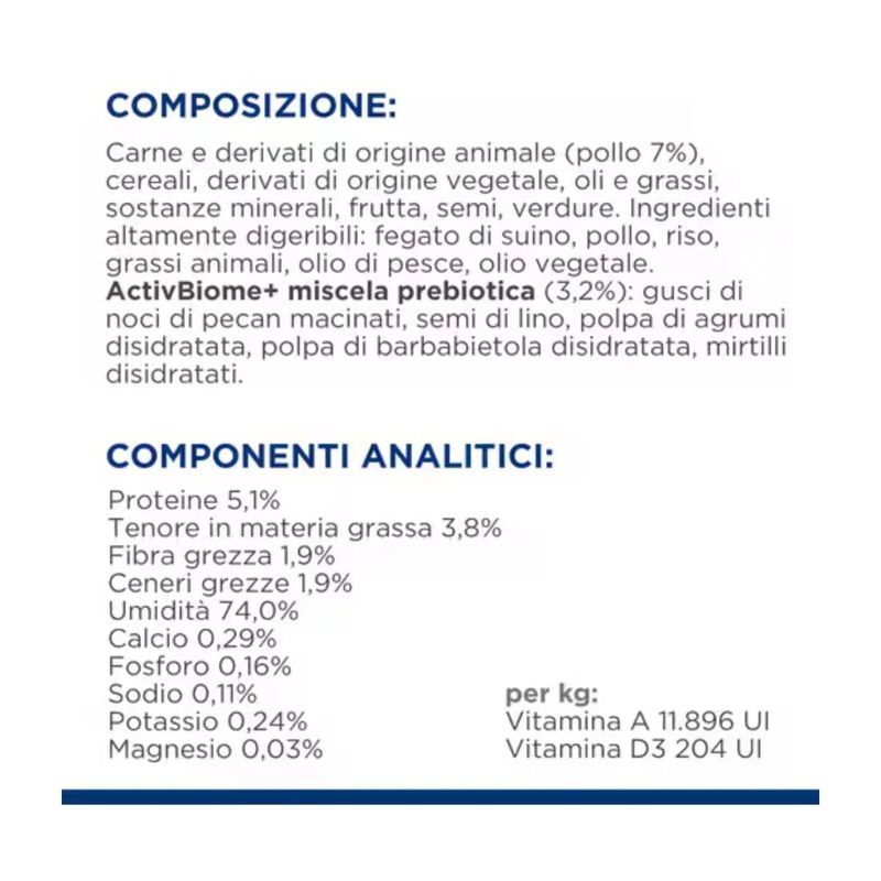 Il Kit Risparmio 370G Hill's Prescription Diet Gastrointestinal Biome è un alimento umido dietetico completo, specificamente formulato per supportare la funzionalità intestinale nei cani adulti. L’innovativa tecnologia di ingredienti contenuti in Hill's Prescription Diet Cane Gastrointestinal Biome è in grado di aiutare, in breve tempo, i cani con disturbi gastrointestinali fibro-responsivi. Anni di ricerca sul microbioma intestinale, composto da miliardi di microrganismi con un equilibrio dinamico tra quelli desiderabili e indesiderabili unico per ogni soggetto, hanno permesso a Hill's di introdurre una miscela esclusiva di fibre in grado di nutrire questo microbioma. La formulazione di questo alimento contiene il pollo come fonte di proteina animale di alta qualità, garantendo un apporto proteico ottimale per il tuo cane. Contiene una miscela di fibre capace di rilasciare e attivare antiossidanti e polifenoli antinfiammatori, supportando così la salute generale e il benessere dell'animale. Grazie a queste proprietà, questo alimento è indicato per cani con enteropatie fibra-responsivi, diarrea antibiotico responsiva, costipazione e diarrea. Questo cibo umido per cani promuove rapidamente una sana consistenza e regolarità delle feci, riducendo il rischio di episodi futuri. Inoltre, un elemento distintivo di questo alimento è la rivoluzionaria tecnologia ActivBiome+, che nutre il microbioma del tuo animale domestico. Questa tecnologia avanzata contribuisce a migliorare la salute intestinale del cane, favorendo la crescita di batteri benefici nell'intestino e migliorando così la qualità delle feci.