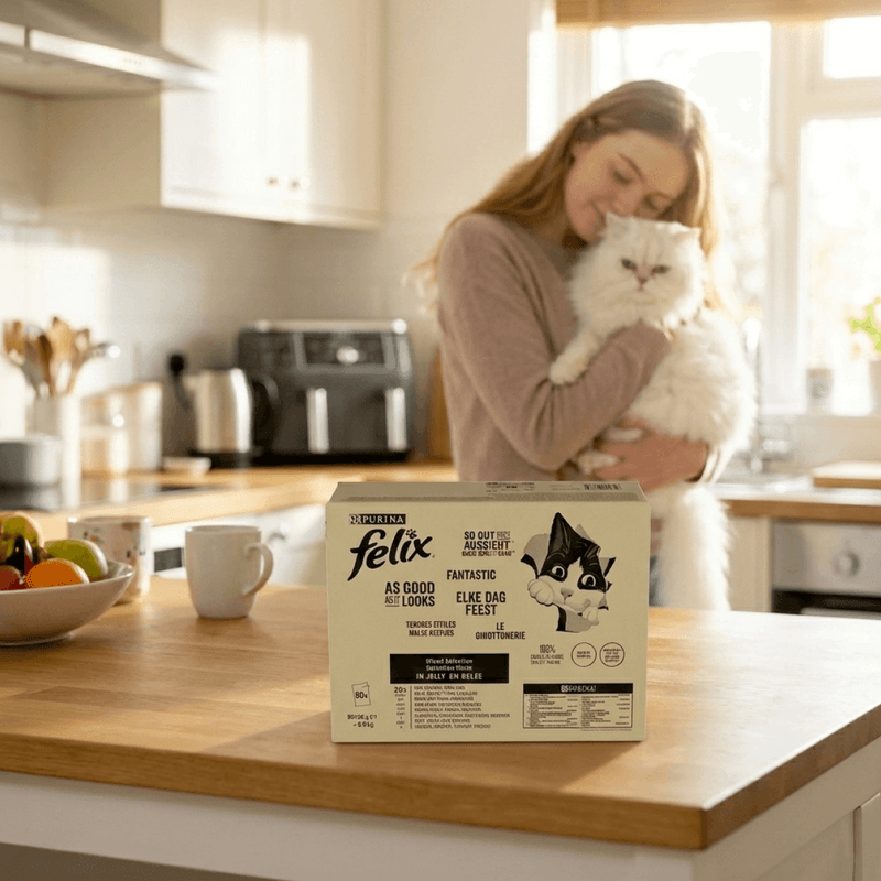 Composizione: Carni e derivati* (14%, di cui pollo 8%), Estratti di proteine vegetali, Pesci e sottoprodotti dei pesci, Sostanze minerali, Zuccheri. *bocconcini: 44% carni e derivati.