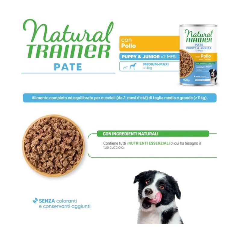 Il Kit Risparmio 24x400G Natural Trainer Puppy Medium Maxi rappresenta una scelta nutrizionale completa e bilanciata per cuccioli di cane di taglia media e grande (più di 11 kg di peso), dai 2 mesi. Ogni lattina di pollo contiene un alimento prodotto con ingredienti rigorosamente controllati e di elevatissima qualità. I componenti nutrizionali sono stati attentamente controllati, e le relative dosi bilanciate per favorire il benessere generale dell’animale. Questo delizioso paté aiuta la funzionalità intestinale grazie ai prebiotici di origine naturale, provenienti dall'estratto di radici di cicoria, che favoriscono il nutrimento e l’equilibrio del microbiota intestinale. La formula è arricchita con estratto di agrumi e mela 100% naturale, che contengono enzimi digestivi naturali per favorire una migliore digestione e assorbimento dei nutrienti. Il paté morbido è altamente appetibile anche per i cani con il palato più esigente.