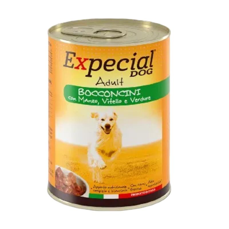 Kit Risparmio 24x405G Expecial Dog Adult è un alimento umido completo in lattina, ideale per cani adulti, che offre al tuo fedele amico una delizia culinaria che soddisferà anche il palato più esigente. Questo alimento senza coloranti e aromi artificiali contiene bocconi di carne, avvolti in una saporita salsa che gli farà venire l'acquolina in bocca, inoltre ogni trancio morbido è creato con gli ingredienti più pregiati, garantendo al tuo cane un momento di piacere autentico e unico. La formula di questo alimento è arricchita con vitamine essenziali come la Vitamina A che svolge un ruolo fondamentale nella salute degli occhi, della pelle e nella resistenza fisica del tuo amico peloso. Grazie a questa vitamina, puoi essere certo che il tuo cane mantenga la sua vista nitida e la sua pelle radiosa, mentre mantiene un alto livello di energia e vitalità. Questa prelibatezza è anche una fonte preziosa di Vitamina D3, che svolge un ruolo essenziale nel metabolismo del calcio e nella salute delle ossa. Grazie a questa vitamina, il tuo cane può godere di ossa forti e sane, riducendo il rischio di problemi muscoloscheletrici e mantenendo la sua mobilità e agilità per tutta la vita. Inoltre, questo alimento è arricchito con Vitamina E, un potente antiossidante che svolge un ruolo chiave nella protezione cellulare. Grazie alla presenza di questa vitamina, il tuo cane può difendersi dai danni dei radicali liberi e mantenere un sistema immunitario forte e reattivo e contribuisce a mantenere la pelle del tuo cane sana e luminosa, proteggendola dagli effetti dannosi dell'invecchiamento e dell'ambiente. Il solfato rameico pentaidrato presente nel nostro cibo umido contribuisce a rafforzare i tessuti connettivi del tuo cane, promuovendo la formazione di collagene ed elastina. Grazie a questo minerale essenziale, il tuo cane può godere di una pelle elastica e di una pelliccia lucente, mentre mantiene la sua forza e la sua agilità nel corso degli anni.