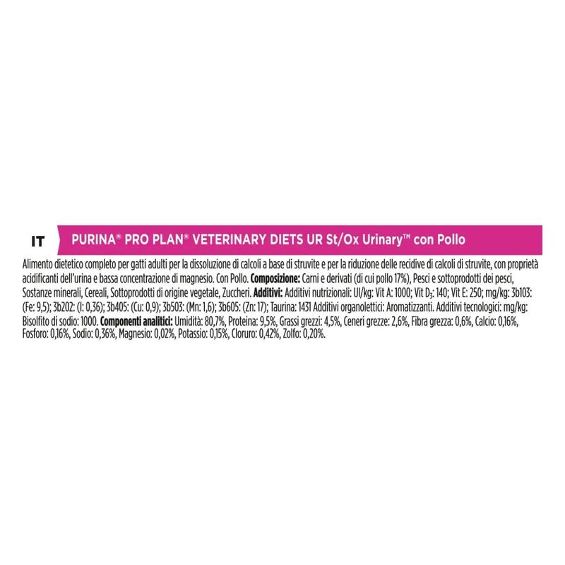 I problemi delle vie urinarie possono colpire i gatti, influendo sulla loro salute e sul loro benessere generale. Kit Risparmio 30x85G Purina Pro Plan Veterinary Diets Cat Ur Urinary Pollo è un alimento umido dietetico completo, formulato appositamente per gatti adulti con esigenze legate alla gestione o prevenzione di calcoli urinari. Grazie alla sua composizione bilanciata, questo prodotto contribuisce a contrastare la formazione di calcoli di struvite e ossalato di calcio, favorendone anche la dissoluzione, mentre supporta il benessere delle vie urinarie.