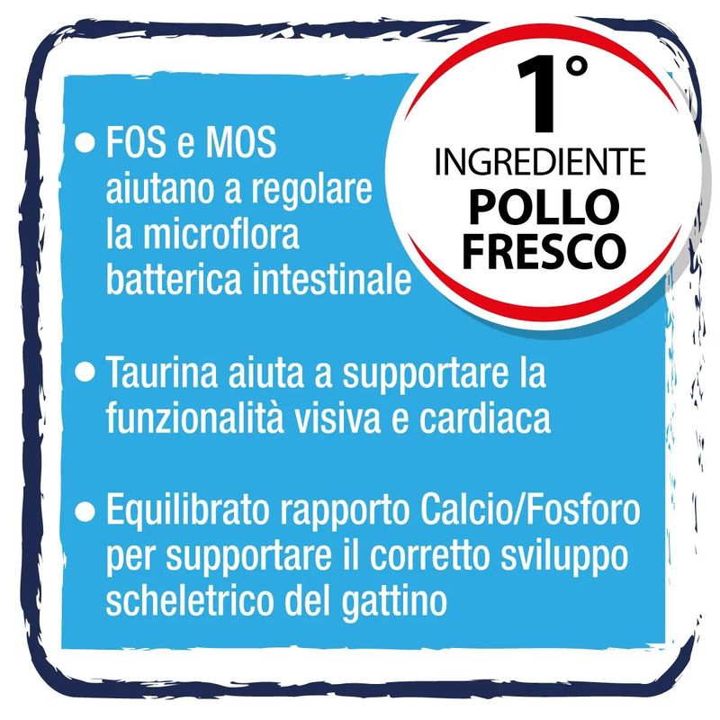Hi Chicken Kitten Pollo rappresenta una scelta nutrizionalmente completa e perfettamente adatta ai cuccioli di tutte le razze di gatti, offrendo un supporto ottimale durante le diverse fasi della crescita. Grazie alla sua formulazione monoproteica basata esclusivamente il maiale come unica fonte di proteine animali, questo alimento fornisce una soluzione ideale per garantire una dieta equilibrata e facilmente digeribile ai piccoli amici a quattro zampe. La formula è stata appositamente arricchita per sostenere la salute intestinale del tuo gatto con M.O.S (mannan-oligosaccaridi) e F.O.S (frutto-oligosaccaridi). Inoltre, la presenza di fonti importanti di DHA aiuta lo sviluppo cognitivo del tuo cucciolo.