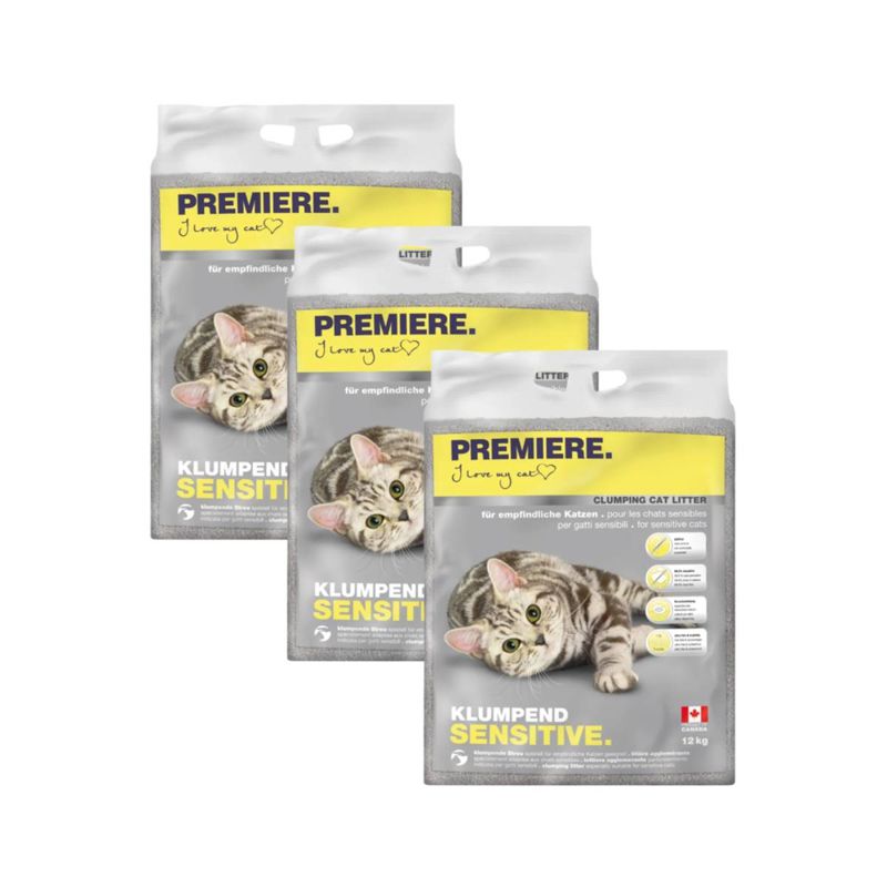 La Kit Risparmio 3x12L Premiere Lettiera Gatto Sensitive rappresenta una soluzione di alta qualità per soddisfare le esigenze dei gatti sensibili e dei loro proprietari attenti alla salute e al benessere degli animali domestici. Questa sabbia è realizzata con materiali naturali altamente assorbenti, che aiutano a trattenere efficacemente l'umidità e i cattivi odori, mantenendo così la cuccia del gatto fresca e pulita per più tempo. La Premiere Sensitive è formulata senza l'aggiunta di fragranze artificiali. Questo è particolarmente vantaggioso per i gatti sensibili che potrebbero reagire negativamente a profumi troppo intensi o a sostanze chimiche irritanti presenti in alcune fragranze.