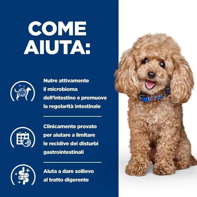 Il Kit Risparmio 3x1KG Hill's Prescription Diet Dog Gastrointestinal Biome Mini è un alimento secco dietetico completo, specificamente formulato per ridurre i disordini di assorbimento intestinale e compensare la maldigestione nei cani adulti di taglia piccola. Questo alimento è progettato per nutrire attivamente il microbioma intestinale del tuo cane, promuovendo feci sane e regolari. È clinicamente dimostrato che aiuta a limitare la ricorrenza di disturbi digestivi e contribuisce a lenire il tratto digestivo. La formulazione di questo alimento contiene il pollo come fonte di proteina animale di alta qualità, garantendo un apporto proteico ottimale per il tuo cane. Inoltre, il prodotto è arricchito con una miscela unica di fibre prebiotiche che supportano la salute intestinale. Gli ingredienti altamente digeribili, insieme a un elevato livello di sodio e potassio, aiutano a mantenere l'equilibrio elettrolitico e favoriscono un'efficace digestione. Un elemento distintivo di questo alimento è la rivoluzionaria tecnologia ActivBiome+, che nutre il microbioma del tuo animale domestico. Questa tecnologia avanzata contribuisce a migliorare la salute intestinale del cane, favorendo la crescita di batteri benefici nell'intestino e migliorando così la qualità delle feci.