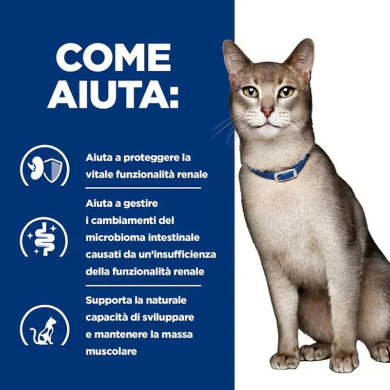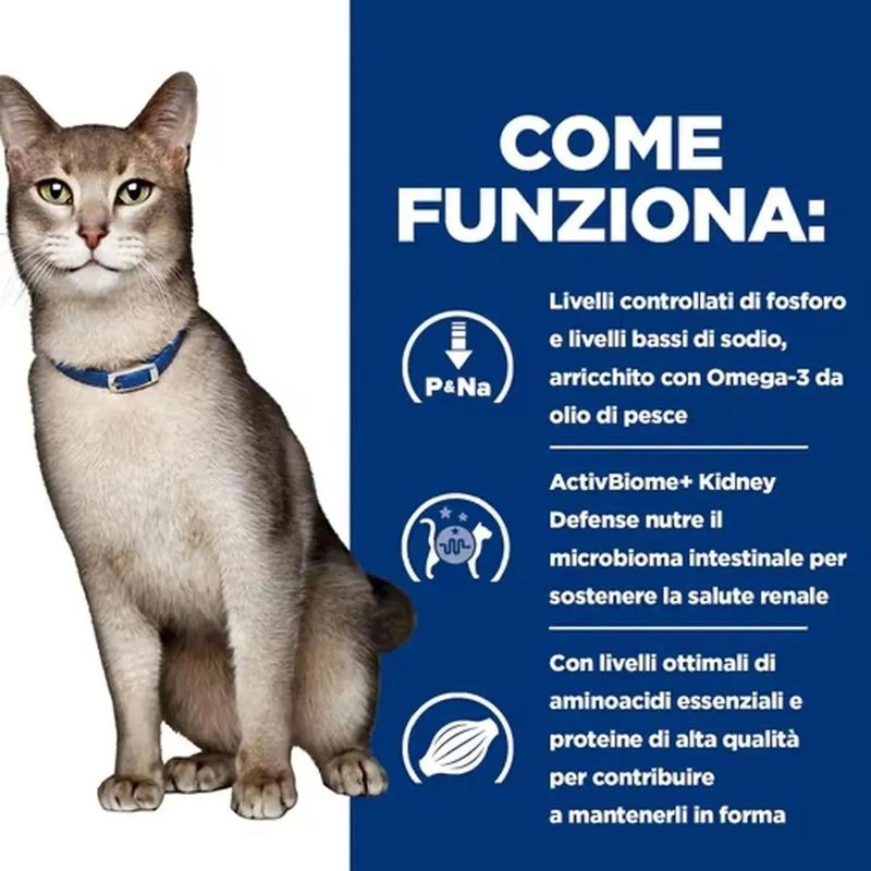 Il Kit Risparmio 3x3KG Hill's Prescription Diet Cat k/d Kidney Care è un alimento dietetico completo, appositamente formulato per supportare la funzione renale nei gatti adulti con insufficienza renale. Con un contenuto ridotto di fosforo e proteine di alta qualità, aiuta a limitare il carico sui reni, riducendo lo stress renale. Inoltre, la tecnologia ActivBiome+ contribuisce attivamente alla salute del tratto digerente e del microbioma intestinale, migliorando il benessere digestivo e il comfort generale del tuo felino. La formulazione è arricchita con omega-3 derivati dall’olio di pesce e contiene una bassa quantità di fosforo e sodio, elementi fondamentali per sostenere la funzione renale e prevenire il peggioramento della condizione renale. Hill's Prescription Diet k/d al tonno è un alimento completo ed equilibrato, garantendo tutte le sostanze nutritive essenziali per mantenere il tuo gatto in salute. Per ottenere i migliori risultati, si consiglia di mantenere una dieta costante e a lungo termine con questo prodotto. Puoi combinare le formule secche con quelle in lattina o bustina per variare la dieta del tuo gatto e offrirgli un’alimentazione completa e bilanciata.