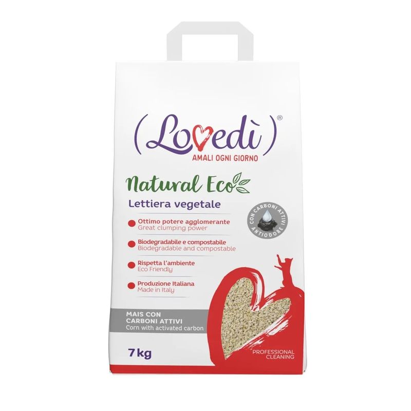 La Kit Risparmio 3x7KG Lovedì Lettiera Natural Eco per gatti è a base di mais, è ideale per chi cerca un prodotto funzionale per l'igiene del gatto e allo stesso tempo rispettoso dell'ambiente. La lettiera vegetale è 100% biodegradabile e compostabile, viene prodotta utilizzando energia pulita e fonti rinnovabili di materie prime, senza l'utilizzo di additivi chimici. La Kit Risparmio 3x7KG Lovedì Lettiera Natural Ecoè addizionata di carboni attivi in grado di catturare in maniera estremamente efficace i cattivi odori. Il carbone attivo è caratterizzato da una porosità estremamente elevata che ha una grandissima superficie specifica, questa caratteristica consente di legare e imprigionare efficacemente gli odori sgradevoli. La lettiera può essere smaltita nel WC o nei rifiuti organici (rispettando le disposizioni del comune). La lettiera è adatta ad ogni tipo di vaschetta e ad ogni gatto poiché soffice sotto alle zampette del tuo micio. La lettiera vegetale si distingue per la rapida assorbenza dei liquidi formando subito una palla compatta, mantenendo così il resto della vaschetta asciutta e pulita. Inoltre neutralizza in maniera efficace gli odori, risultando pratica e semplice da pulire, bisogna solo rimuovere i grumi solidi evitando così gli sprechi e rendendo il prodotto così più economico. Questa sabbia non contiene additivi chimici ed è biodegradabile. Indispensabile per chi ha un occhio di riguardo verso l’ambiente circostante. Disponibile nel pratico sacco con manico. Per un uso più efficace riempire la vaschetta con uno strato di lettiera di circa 7 cm, la durata media per un gatto è di 20 giorni. Rimuovi quotidianamente le parti agglomerate e gli escrementi con una paletta traforata e ripristina il livello iniziale della lettiera.