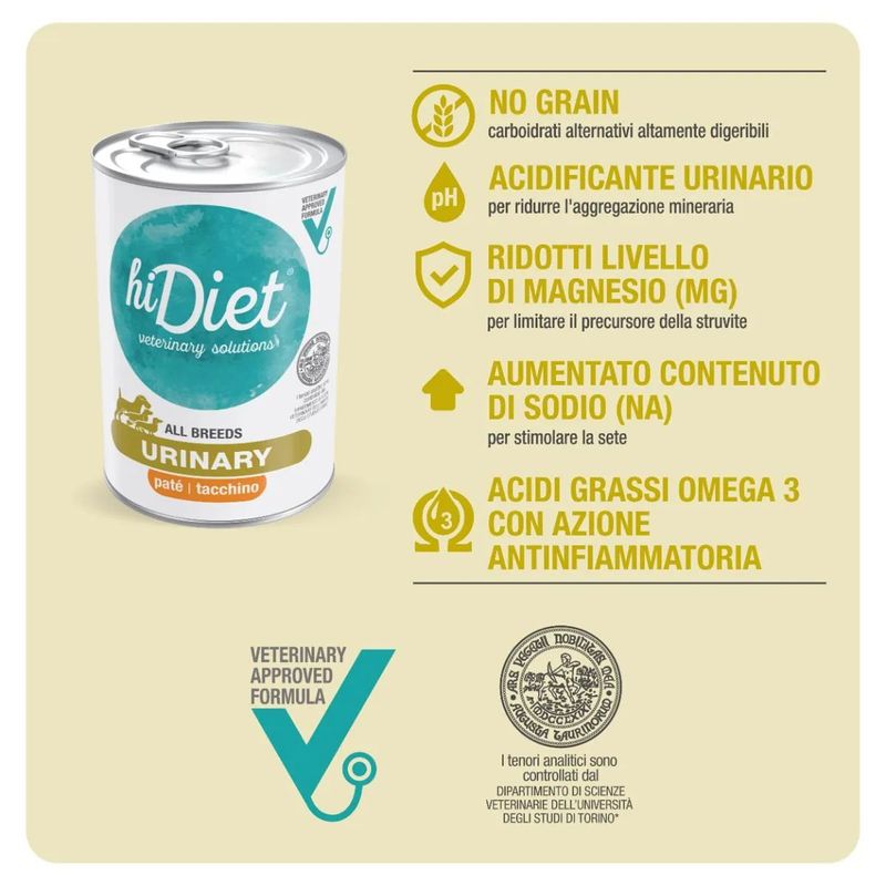 Se stai cercando un'alimentazione avanzata per favorire la dissoluzione dei calcoli a base di struvite e ridurre le recidive nei problemi urinari del tuo compagno peloso, Hi Diet Dog Urinary è la soluzione ideale. La linea dietetica, creata dai veterinari è specificamente formulata per rispondere alle esigenze nutrizionali particolari associate a condizioni urinarie specifiche. Durante periodi delicati come quelli legati a problemi urinari, è fondamentale fornire al tuo cane la nutrizione adeguata per garantire un recupero ottimale.