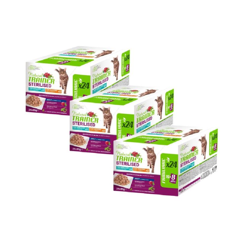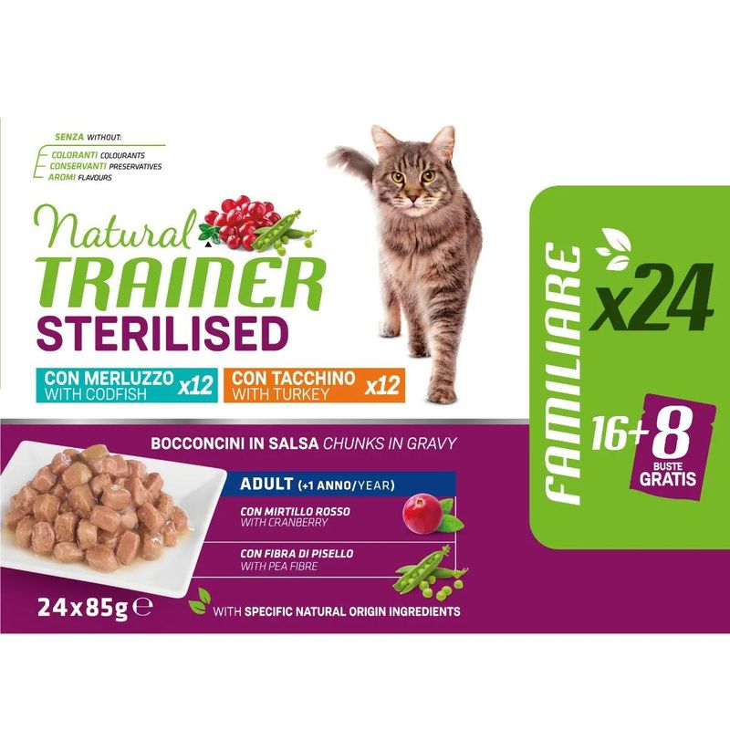 Dopo la sterilizzazione, il metabolismo del gatto può subire cambiamenti, che spesso portano ad un aumento del peso. Il Kit Risparmio 72x85G Natural Trainer Cat Sterilised è un alimento umido in busta formulato con ingredienti naturali per soddisfare le esigenze specifiche dei gatti sterilizzati a partire da un anno di età. Questo alimento senza coloranti, conservanti e zuccheri aggiunti contiene bocconcini di carne fresca o pesce fresco in salsa, e fibre vegetali, come la fibra di pisello, infatti questa combinazione, insieme a un livello moderato di grassi, contribuisce a ridurre il contenuto energetico del cibo, fornendo al contempo una nutrizione equilibrata. Con un'unica fonte di proteine animali, questo alimento fornisce una dieta completa e bilanciata per il tuo gatto sterilizzato. Mentre, i prebiotici di origine naturale provenienti dalla radice di cicoria e dalla polpa di barbabietola favoriscono il nutrimento e il corretto equilibrio del microbiota intestinale, contribuendo alla salute digestiva del tuo animale domestico, mentre il mirtillo aiuta a preservare nel tempo la salute e la funzionalità delle vie urinarie.