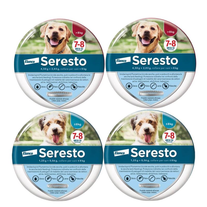 2PZ 38CM 2PZ 70CMKit Risparmio Seresto Collare 4PZ: Proteggi il tuo cane da pulci, zecche e malattie trasmesse da vettori con il kit conveniente che include due collari Seresto per cani fino a 8 kg e due per cani oltre gli 8 kg. Offri al tuo amico a quattro zampe fino a 8 mesi di protezione continua e sicura con un'unica soluzione.