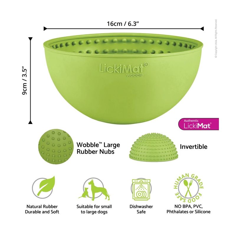 LickiMat Gioco Cane Ciotola Wobble è un accessorio ideale per i cani di ogni taglia e razza, progettato per trasformare la somministrazione di cibo in un’esperienza divertente e stimolante. Questo tappetino in gomma a base vegetale, con una base curva e protuberanze in gomma, promuove le leccature ripetitive che favoriscono la produzione di endorfine, riducendo così ansia e stress. Perfetto per cani di tutte le taglie, è l’accessorio ideale per migliorare l’alito e la salute orale. Inoltre, incoraggia una digestione più lenta, evitando il gonfiore e favorendo un processo digestivo più sano. Realizzato con materiali sicuri e privi di BPA, PVC e ftalati, è anche resistente e facilmente lavabile, rendendolo un prodotto duraturo e sicuro per il tuo cane.