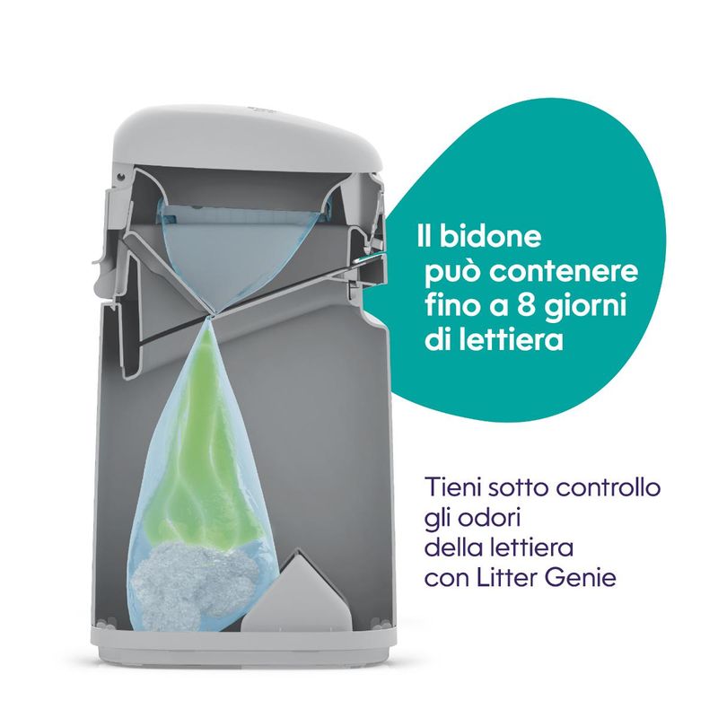 Litter Genie Easy Roll Bidone Igienico è la soluzione ideale per gestire la lettiera del tuo gatto in modo igienico, pratico e senza cattivi odori. Questo sistema avanzato ti consente di raccogliere facilmente i bisogni del tuo gatto, sigillarli e conservarli nel bidone fino a 8 giorni, senza dover portare ogni volta i rifiuti nel bidone della spazzatura. Dotato di ampia apertura di smaltimento, rende le operazioni quotidiane ancora più semplici e pulite, riducendo i residui attorno alla lettiera. Il coperchio a chiusura ermetica e la pellicola multistrato con tecnologia barriera anti-odore bloccano efficacemente gli odori sgradevoli, migliorando l’igiene dell’ambiente domestico. Le ricariche Easy Roll contengono 24 sacchetti pretagliati su un rotolo e durano fino a 3 mesi per un gatto, offrendo un’alternativa comoda e sostenibile rispetto ai tradizionali sacchetti usa e getta. Inoltre, il bidone è realizzato in plastica riciclata al 99%, una scelta ecologica per i proprietari più attenti all’ambiente.