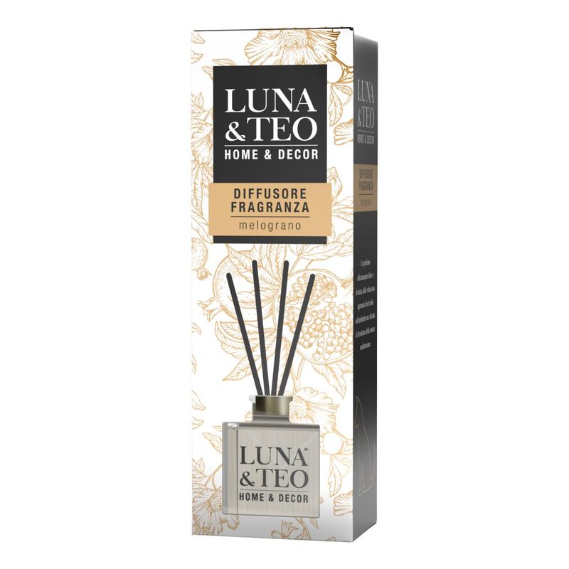 Questo Luna e Teo Diffusore Fragranza Melograno è un diffusore per ambienti con i bastoncini. La boccetta contiene 100ML di prodotto. La fragranza è al profumo di melograno, un profumo delicatamente dolce e fruttato, dalla velata nota agrumata che irradia nell’ambiente una sferzata di freschezza della natura mediterranea. Il diffusore a bastoncino è il profumatore must have nelle nostre case, un classico dalle linee moderne e decise, si adatta con eleganza e sobrietà a qualsiasi arredamento. Semplice ed elegante, questo diffusore, creato con elementi naturali per offrire questa fragranza piacevole all’olfatto senza recare disturbo a quello del vostro amico peloso. Consigli per l’uso, immergere i bastoncini nella soluzione profumata e capovolgerli di tanto in tanto per aumentare l'intensità della diffusione.