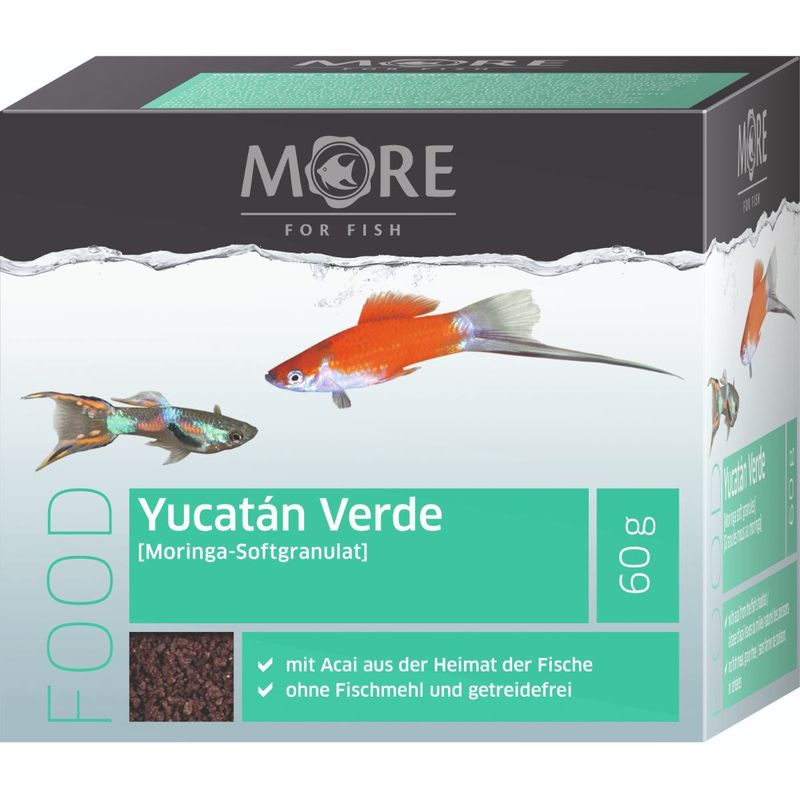 More For Fish Food Yucatan Verde 60G è un alimento verde morbido, perfettamente bilanciato, pensato per tutti i pesci vivipari, in particolare guppy, platy e molly. Grazie a una combinazione di ingredienti di origine vegetale, come spirulina e cavolo riccio, fornisce preziose sostanze nutritive che favoriscono una crescita equilibrata e rafforzano il sistema immunitario. L'aggiunta di prebiotici migliora la digestione e ottimizza l'assorbimento dei nutrienti, contribuendo alla vitalità dei pesci. Il rapporto ottimale tra proteine e grassi assicura uno sviluppo armonioso, mentre l’uso di materie prime di alta qualità, come insetti e krill, garantisce una digestione facile e riduce l’impatto ambientale sull’acquario. La sua consistenza morbida favorisce un’assimilazione ottimale del cibo, rendendolo irresistibile per i pesci. Inoltre, contiene Moringa oleifera, una delle piante più ricche di sostanze nutritive, per un’alimentazione ancora più completa. Senza coloranti e conservanti artificiali, per un pasto sano e naturale.