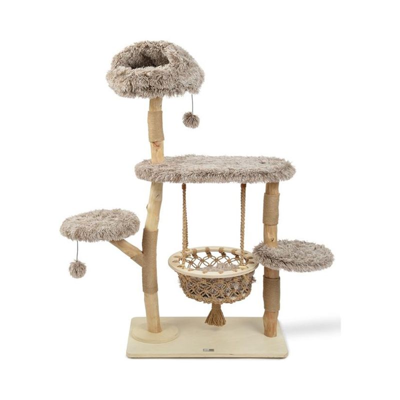 Il raffinato More Tiragraffi Liam è molto più di un semplice tiragraffi: è un vero e proprio centro benessere per gatti! Realizzato con tronchi in legno naturale, rivestimenti in morbida pelliccia sintetica e corda in sisal resistente, questo accessorio unisce estetica e praticità. Ideale per gatti adulti e cuccioli di tutte le taglie, offre spazi per riposare, arrampicarsi e giocare. La struttura è composta da più piattaforme accoglienti, una soffice cuccia panoramica e un'originale amaca sospesa in stile boho chic. Perfetto per soddisfare l’istinto naturale del gatto di graffiare, arrampicarsi e sorvegliare dall’alto, il tiragraffi Liam favorisce anche il relax e la stimolazione mentale. I materiali utilizzati sono resistenti ma delicati sulle unghie e sulle zampette, e ogni dettaglio è pensato per la sicurezza del tuo felino. Completamente privo di sostanze tossiche e realizzato con legno non trattato, è una scelta ecologica e sicura per la tua casa.