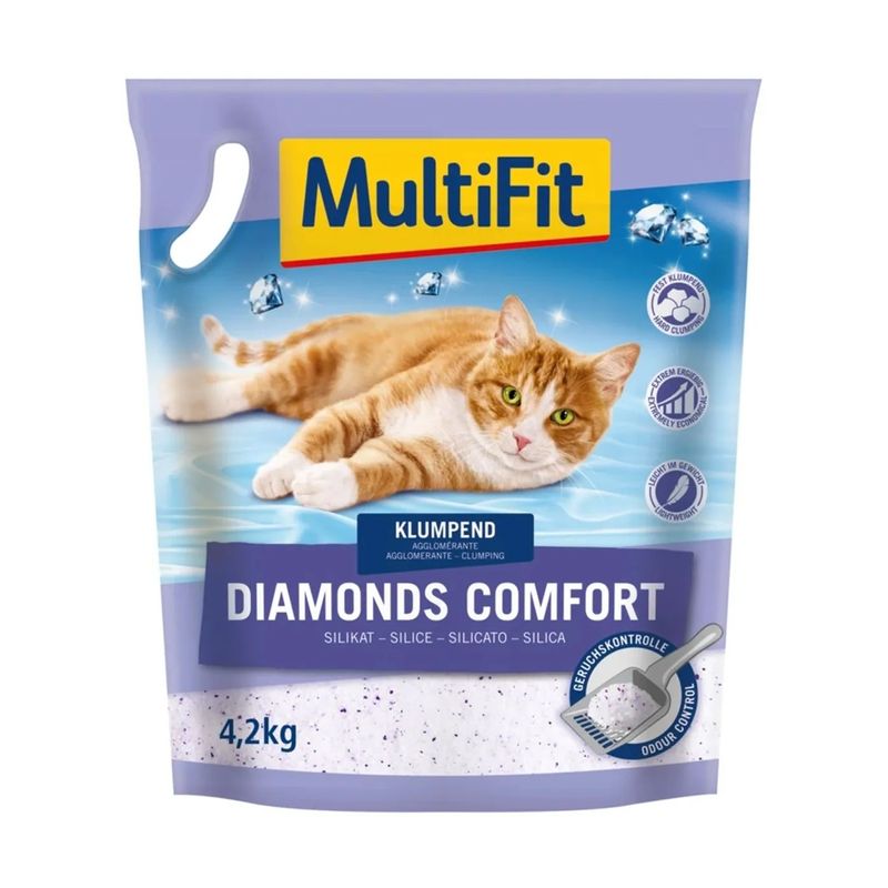 MultiFit Lettiera Gatto Diamonds Comfort Silice Agglomerante è ideale per gatti con elevate esigenze di pulizia e igiene quotidiana. La sua formula unica assorbe rapidamente l'urina e intrappola gli odori sgradevoli in grumi sicuri, mantenendo l'ambiente pulito e fresco. Non contiene additivi chimici e non è profumata, rendendola adatta anche ai gatti più sensibili. Il peso ridotto la rende facile da trasportare, mentre la struttura porosa permette un assorbimento massimo, mantenendo la lettiera pulita più a lungo. Senza polvere e con granelli visibili, è facile da mantenere e rende l'uso della toilette per gatti ancora più comodo e igienico. Per un uso efficace riempire la lettiera del gatto con uno strato alto circa di 8 cm. La lettiera sporca deve essere rimossa ogni giorno e sostituita con una nuova. Con il riscaldamento a pavimento mettere un materiale isolante sotto la lettiera, in legno o polistirolo sotto la lettiera. Questo previene gli odori che potrebbero derivare dal riscaldamento dei liquidi legati nei granuli. Se il tuo gatto non accettasse subito la nuova lettiera, sii paziente o mescola con la lettiera a cui è abituato per la prima volta.