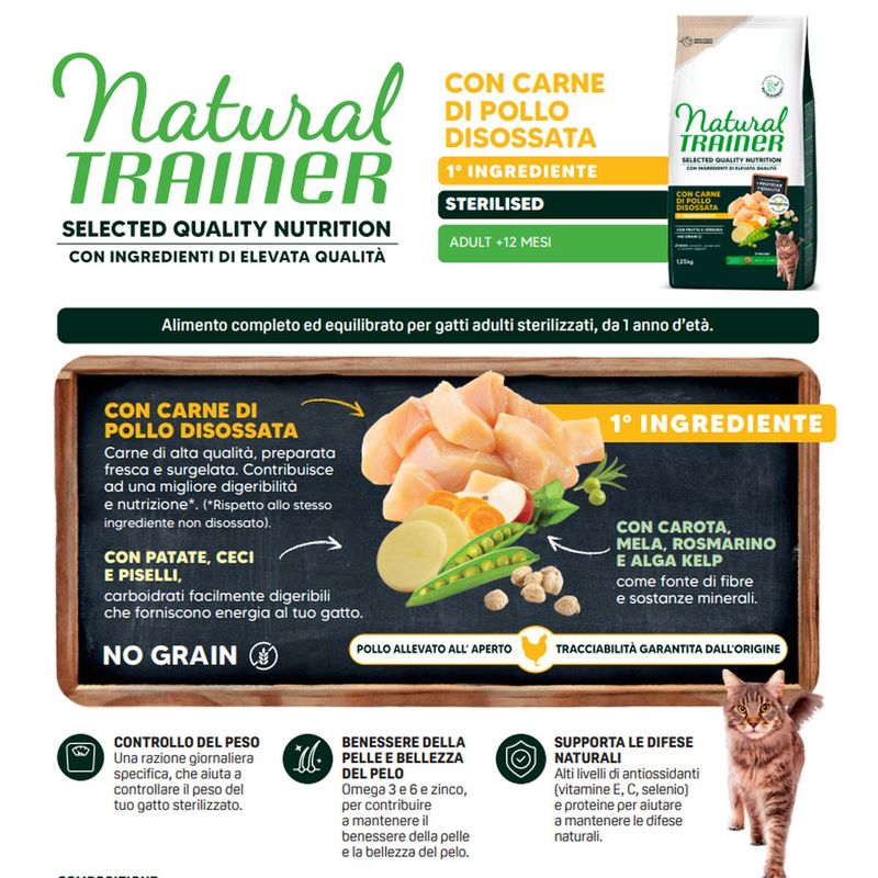 Scegli la qualità naturale e senza cereali del Natural Trainer Selected Gatto Sterilised No Grain Pollo… e conquista il palato del tuo micio ogni giorno!